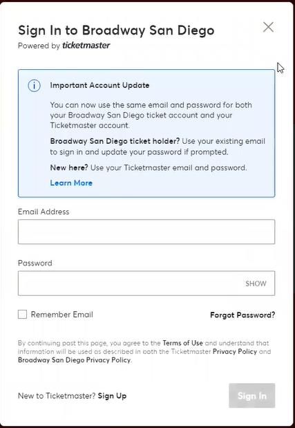 STEP 1: Log in to your MY BROADWAY SAN DIEGO ACCOUNT on a desktop computer.