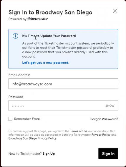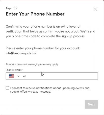 You may be asked to enter your phone number to confirm that you are not a bot. You will be sent a one time code to your phone to verify. You may also opt in to receive SMS updates from Broadway San Diego.