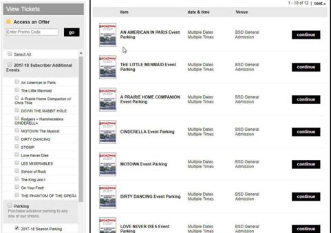 STEP 2: Choose the production for which you would like to purchase parking. The parking pass is good during the entire run of the show, so if you exchange to a different night, your parking is still valid.