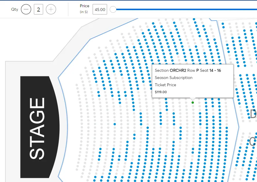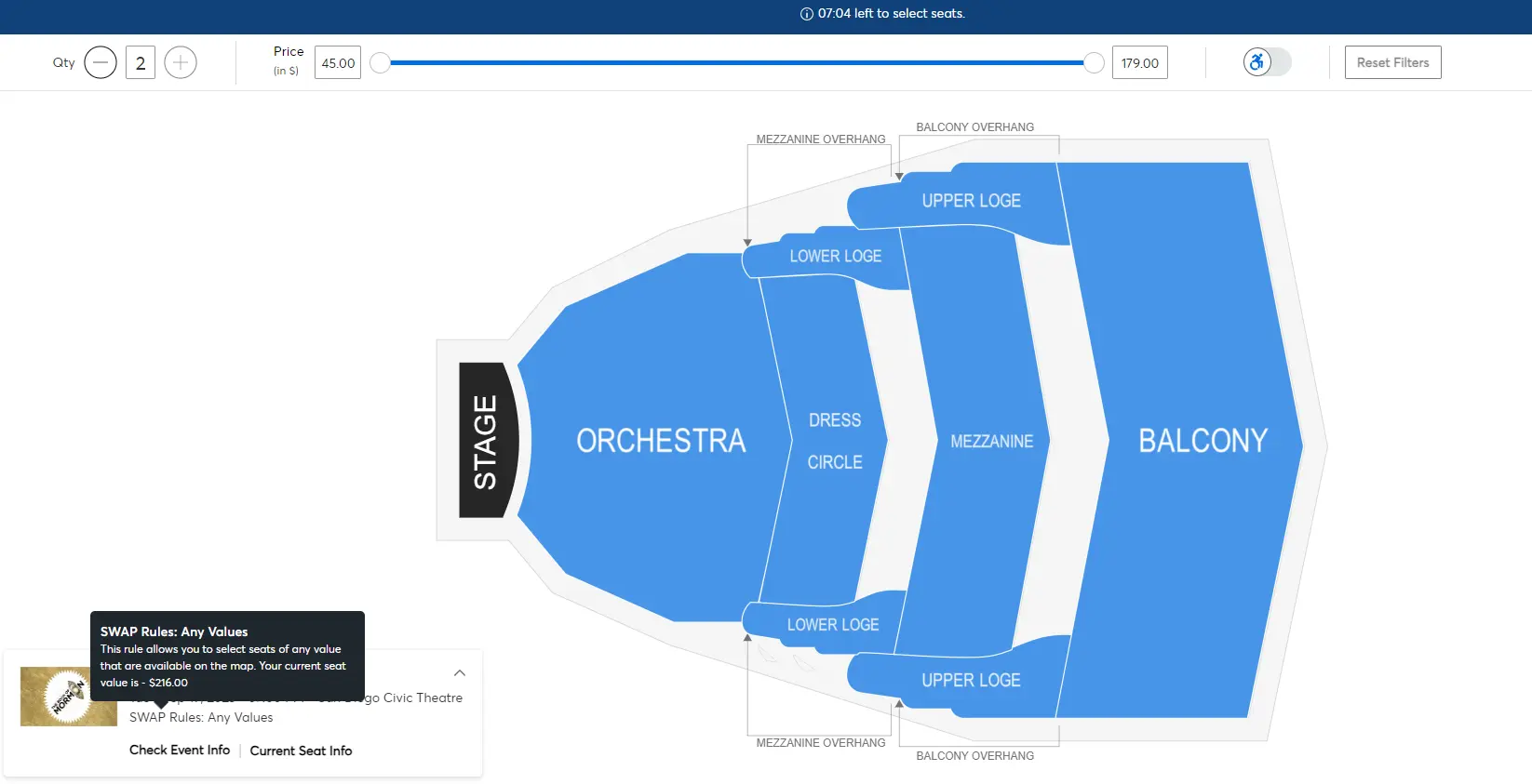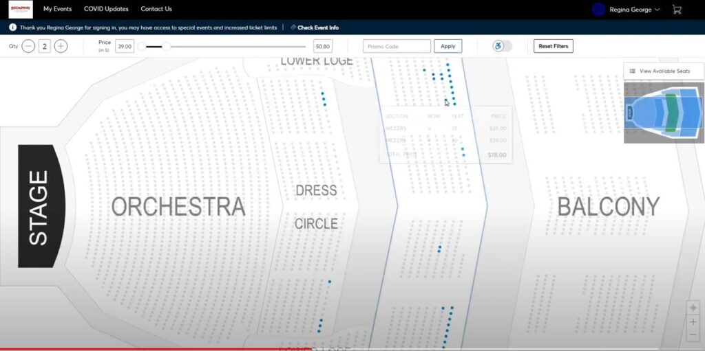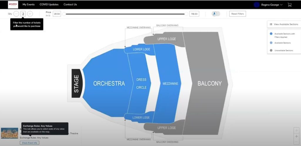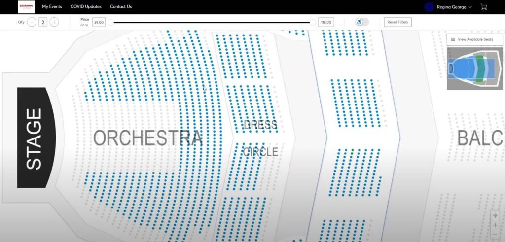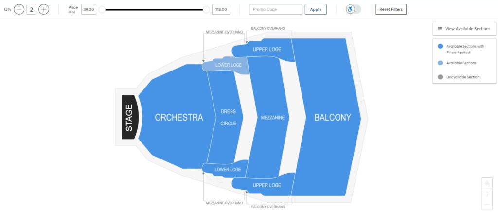 STEP 5: Choose the section of the theatre you would like and then choose your seat(s). You can toggle the quantity of seats, price range, and any accessible needs at the top.