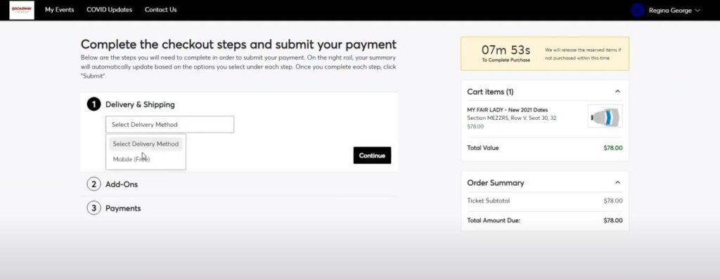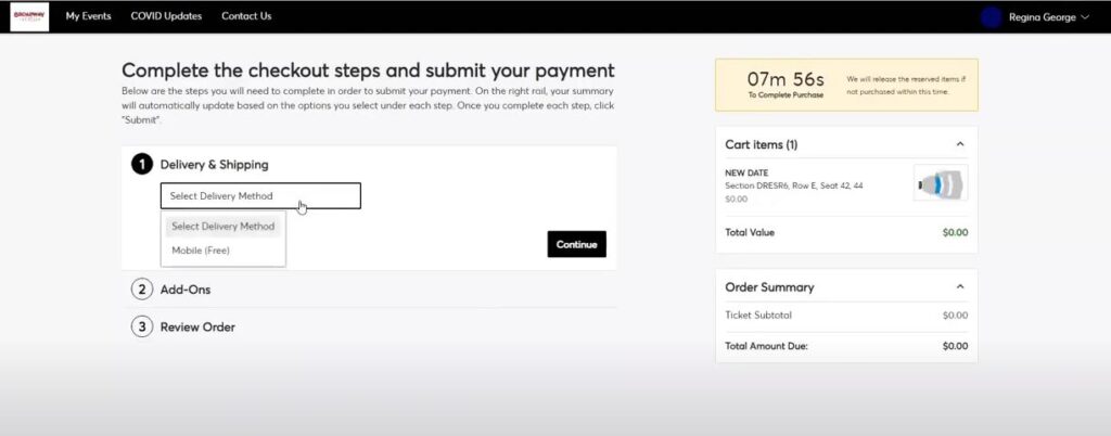 STEP 7: Review the seats you have chosen in your cart, then tap Continue.