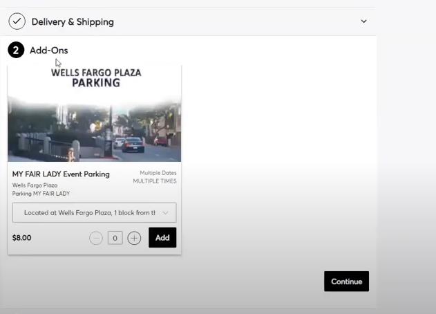 STEP 3: Choose the number of parking passes you would like (1 parking pass per car, not per seat to the show). Click “find seats”.