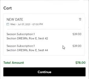 If you are purchasing more than one block of seats or events, you can access your cart anytime by clicking the shopping cart in the upper right corner of your screen.