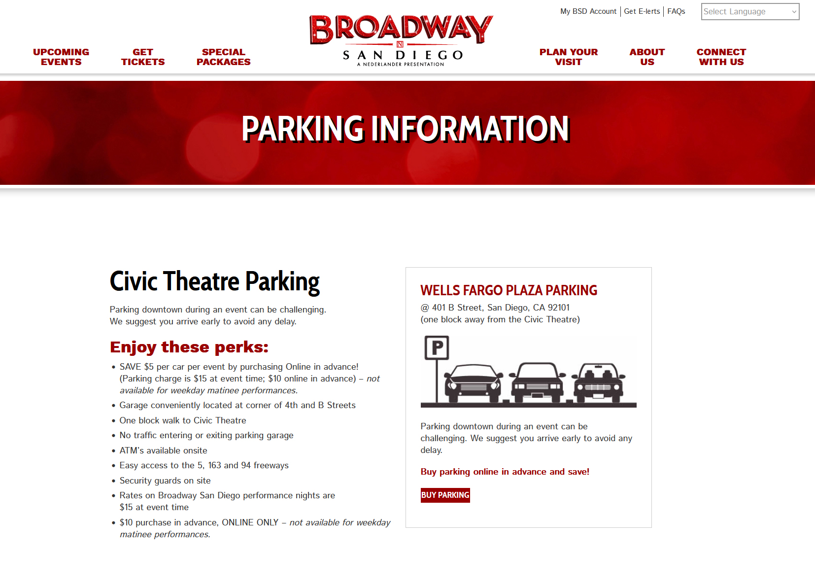 Parking downtown can be difficult, and expensive, but have no fear, you can purchase advance parking at Wells Fargo Plaza (just 1 block from the Civic Theatre) for only $10!