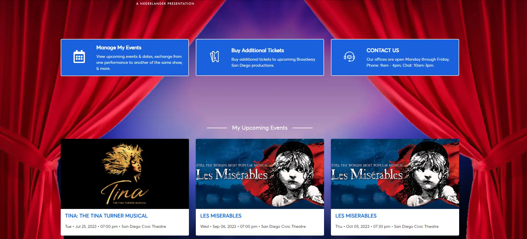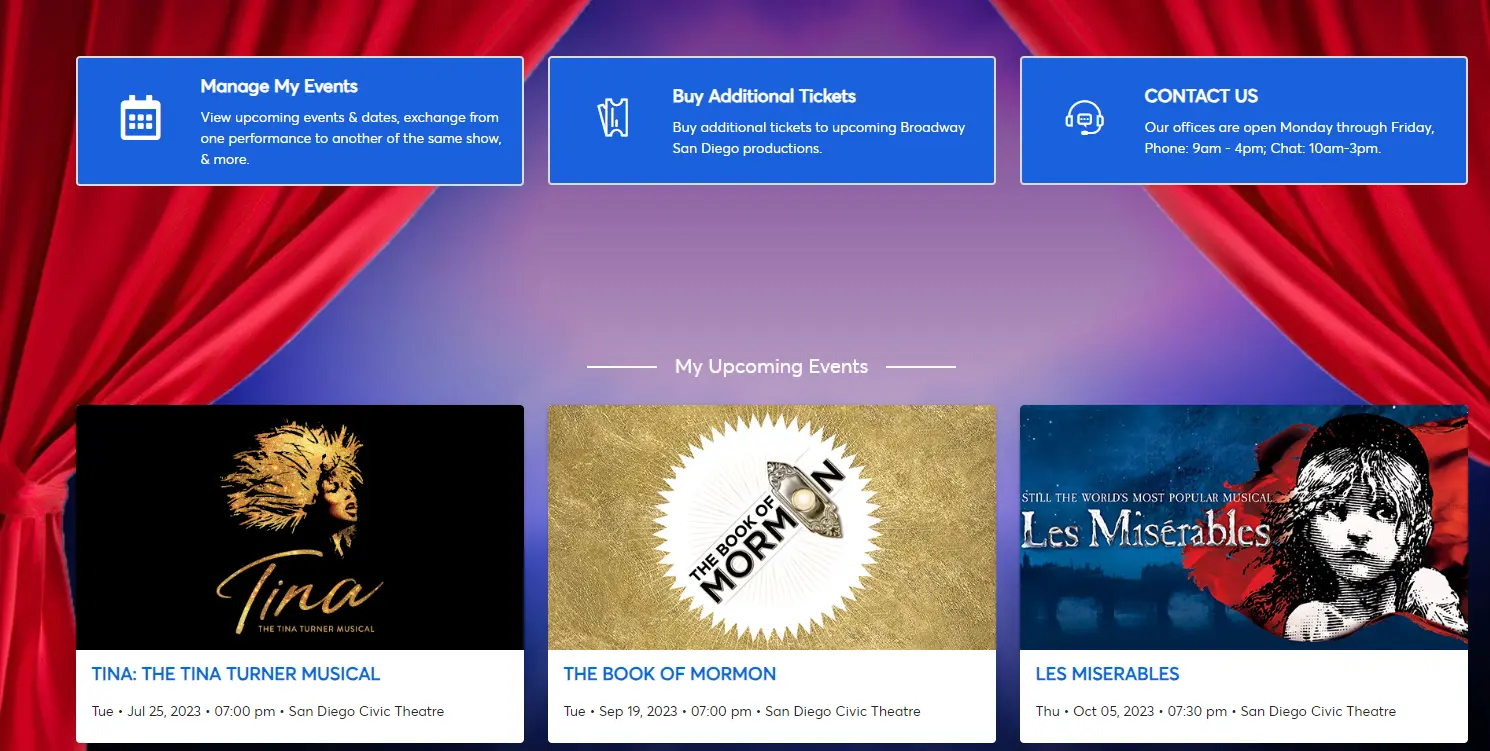 Additional tickets to available Broadway San Diego events can be purchased online at MY ACCOUNT free of charge or by calling (888) 937-8995, Mon-Fri 9am-5pm and Sat 9am-3pm. A $3.00 phone transaction fee will apply per call.