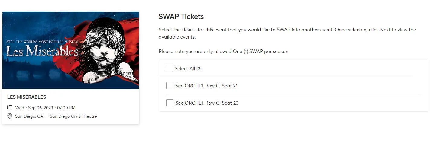 (*Available for most shows. You can Swap into any Added Season Event. The following Season Shows are excluded to Swap into: Suffs, & Juliet, The Notebook, The Sound of Music, Disney’s Beauty and the Beast, Hell’s Kitchen, and Water for Elephants. SWAPS end 2 weeks prior to the opening night performance)