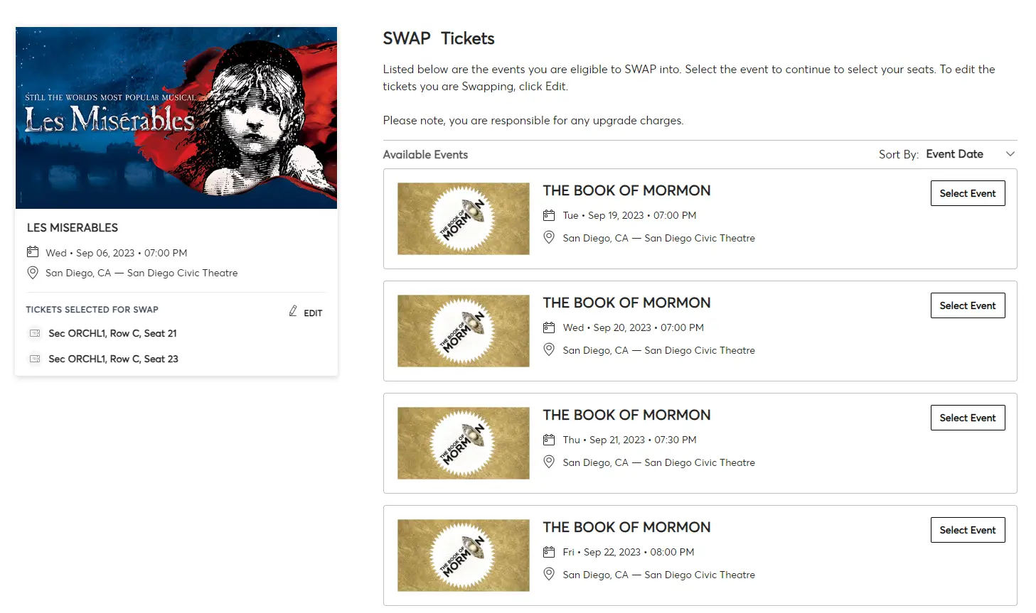 4. Select the Performance you would like to SWAP into. By default, the events are in chronological order. Scroll down to see all available events.