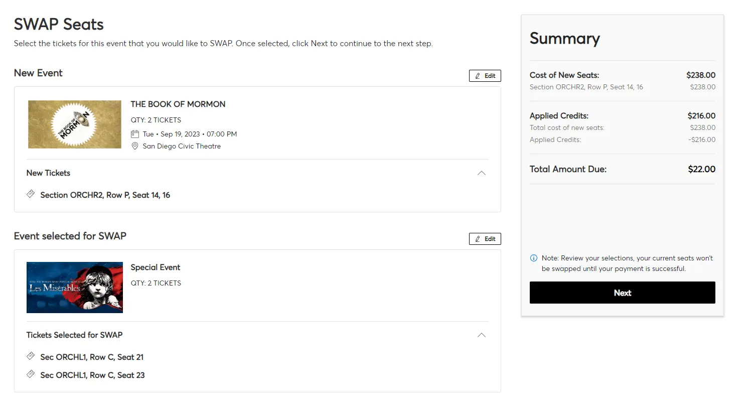 Swap from one show to another show online at MY ACCOUNT or by calling (888) 937-8995, Mon-Fri 9am-5pm and Sat 9am-3pm. Additional costs may apply if Swapping into a higher priced performance.